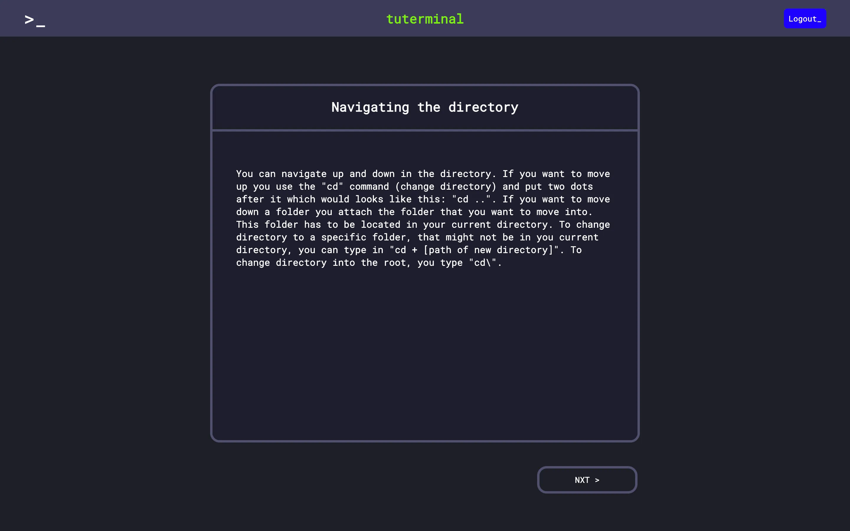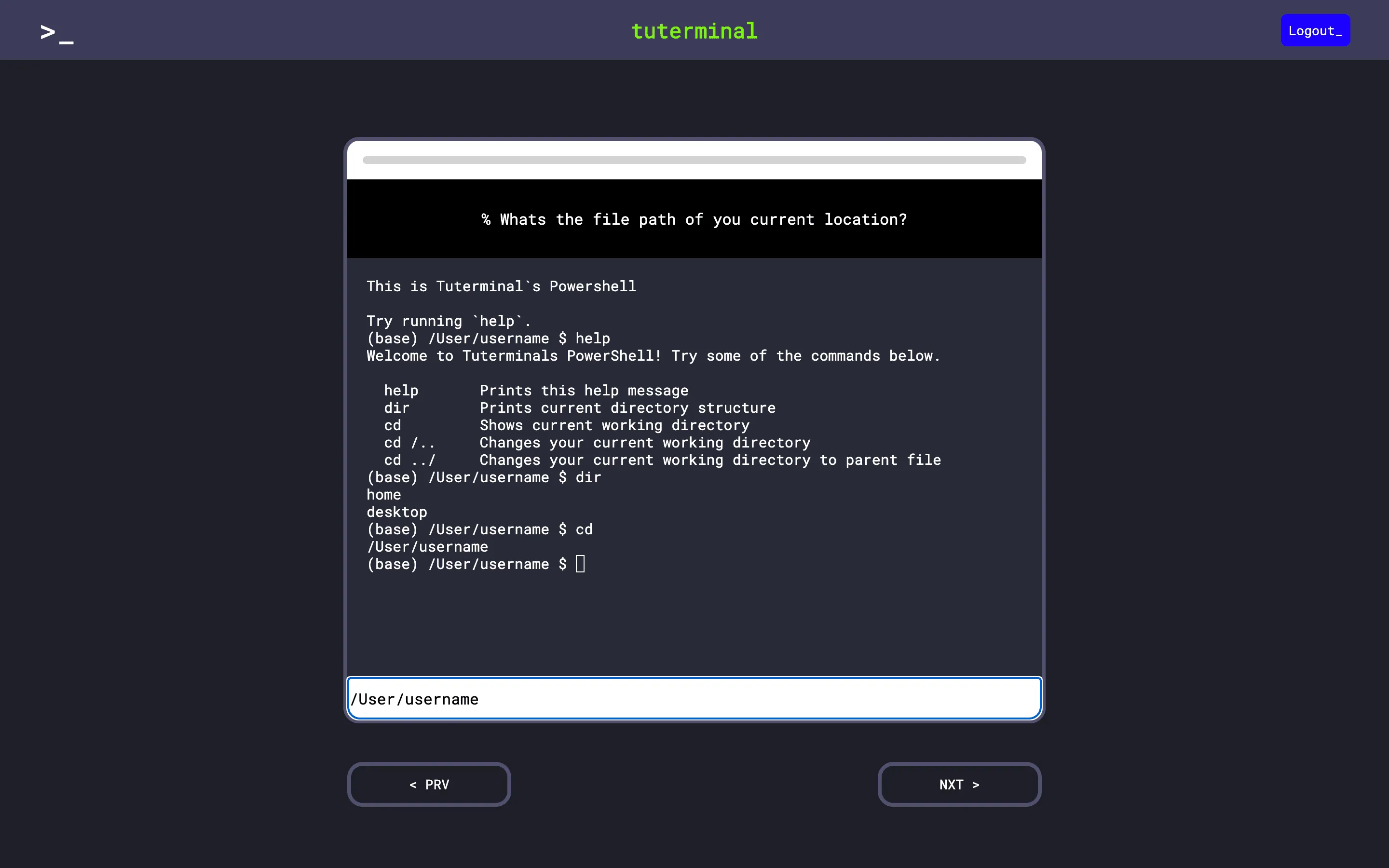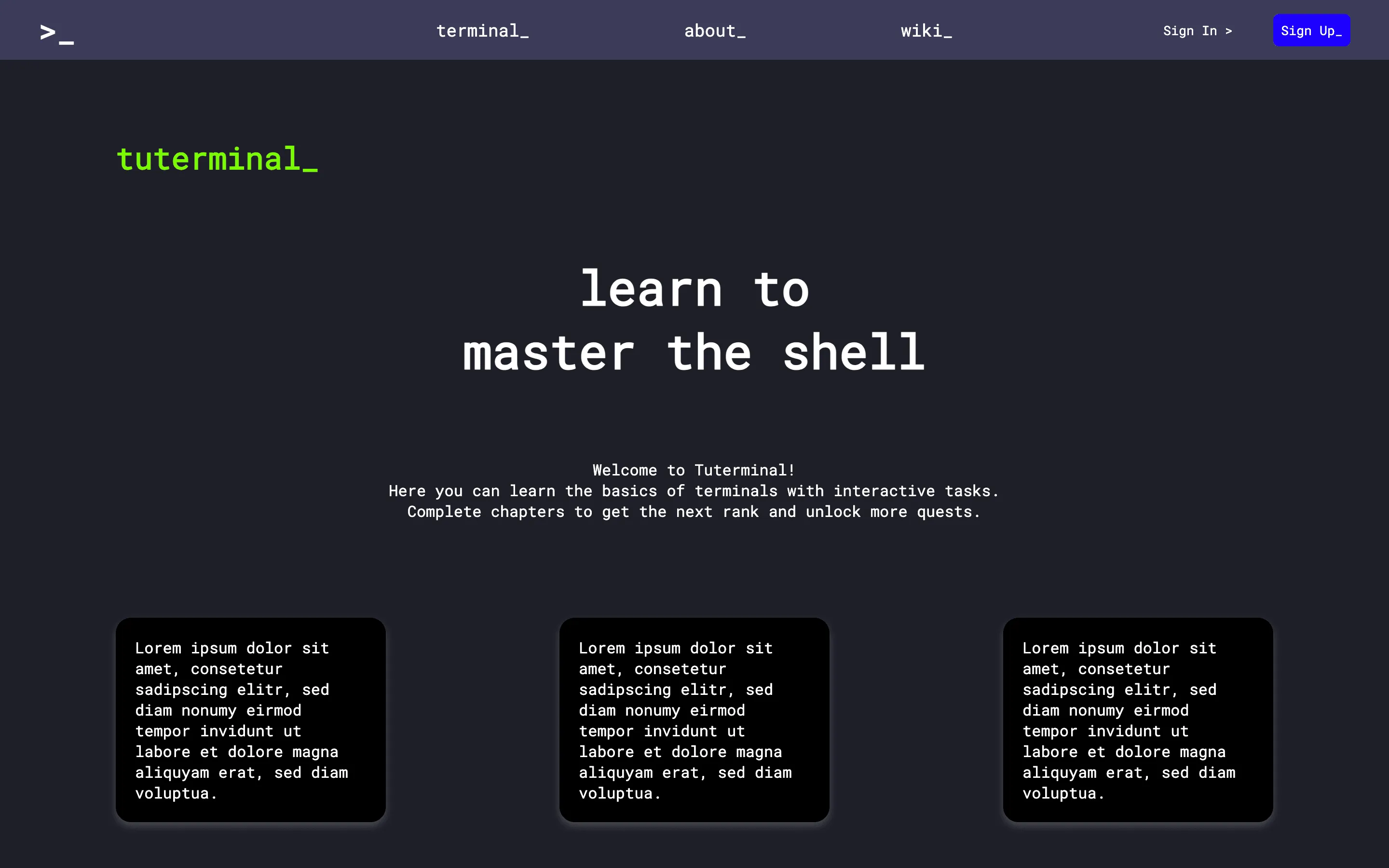 Tuterminal is a web application for people that want to learn hot to master different Shells. It provides tutorials with small exercises to practice the commands for different Shells. It is built modular so that new tutorials can be added easily through an web interface.