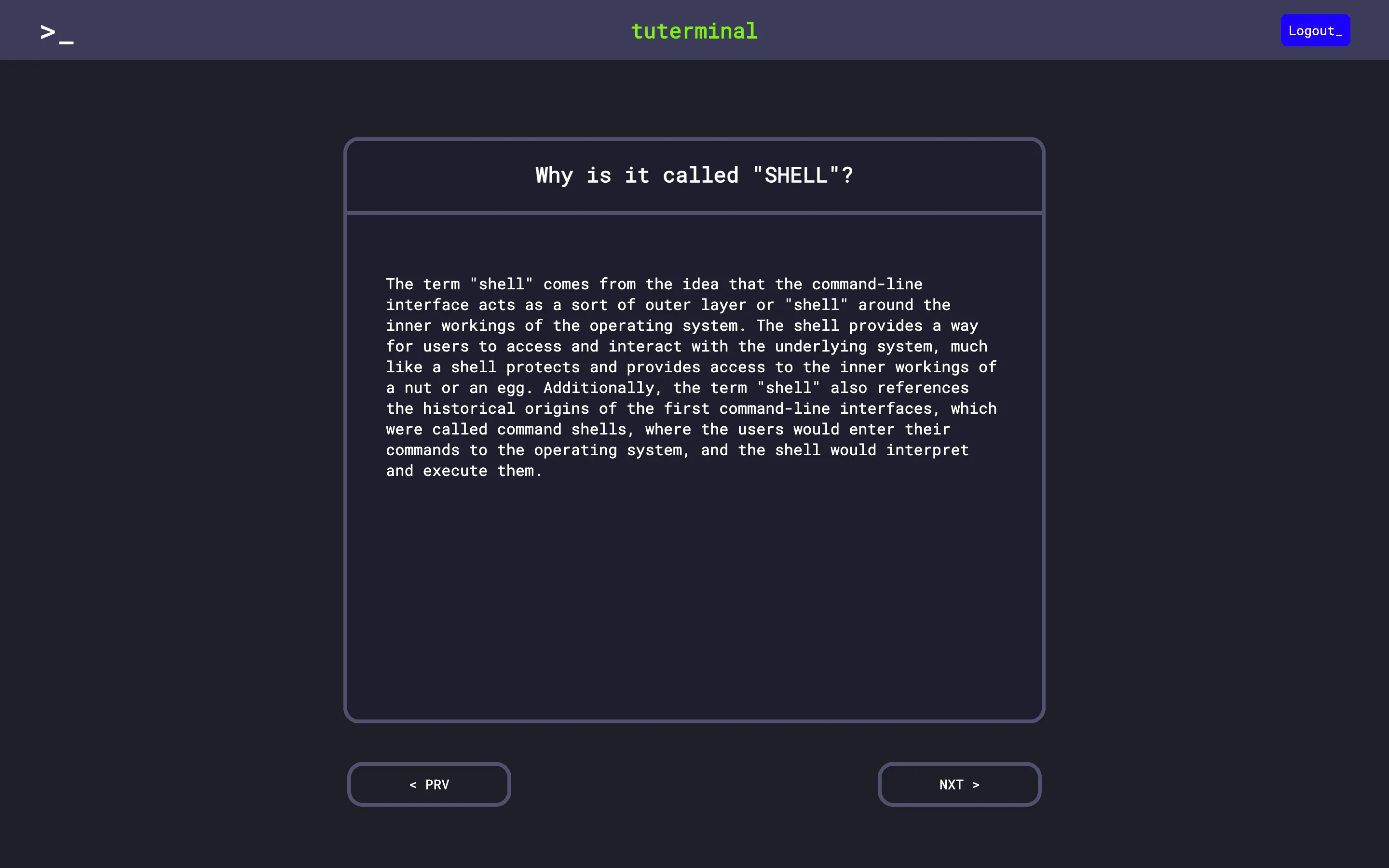 The core concept involves delivering theoretical knowledge about shells to users, followed by practical exercises in a simulated shell environment to reinforce learning. The project also explores the integration of a progression system, assigning users levels based on their completion of tasks. Balancing the social aspect, the project aims to incorporate a reward system, motivating users to successfully conclude topics.